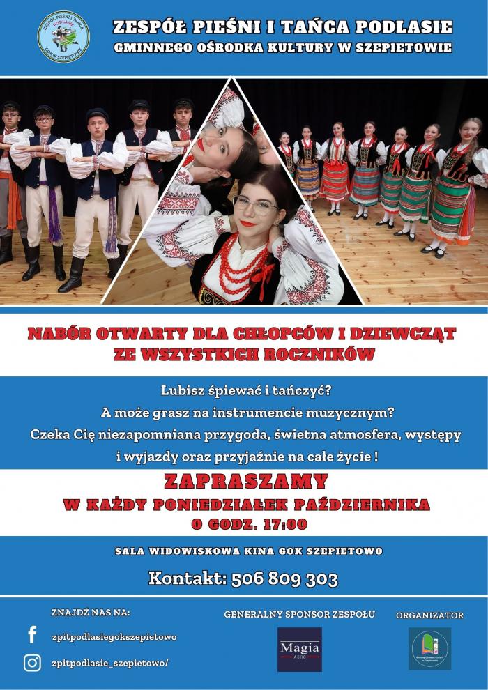Gminny Ośrodek Kultury w Szepietowie ogłasza nabór do Zespołu Pieśni i Tańca „Podlasie”. To wyjątkowa okazja dla wszystkich chłopców i dziewcząt – niezależnie od wieku – aby spróbować swoich sił w śpiewie, tańcu i muzyce.