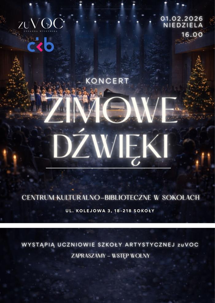 Szkoła Artystyczna zuVOC oraz Centrum Kulturalno-Biblioteczne w Sokołach zapraszają na koncert pt. „Zimowe Dźwięki”.