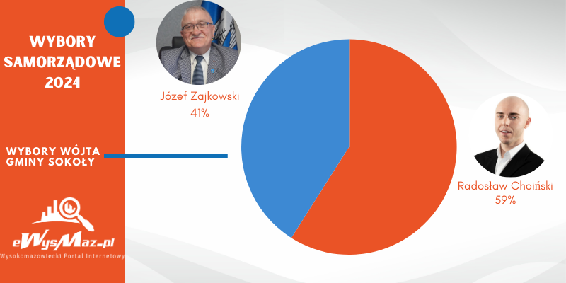 Radosław Choiński został wybrany na nowego wójta gminy Sokoły. W niedzielę, w pierwszej turze wyborów samorządowych, pokonał Józefa Zajkowskiego – wynika z protokołu wyników głosowania i wyników wyborów Gminnej Komisji Wyborczej w Sokołach.